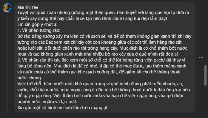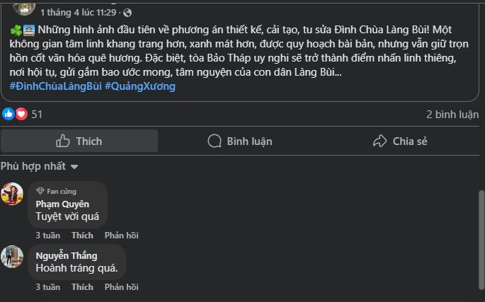 Người dân rất ủng hộ chủ trương này. Đình – Chùa Làng Bùi là linh hồn của quê hương, phải gìn giữ cho bền vững. Nhìn phương án thiết kế mới rất tâm đắc, vừa tôn trọng truyền thống, vừa gọn gang hơn, quy mô lại đẹp hơn.